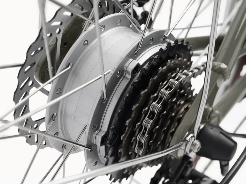 - 250-watt Hyena rear hub motor provides 3 levels of support and delivers 40 Nm of torque