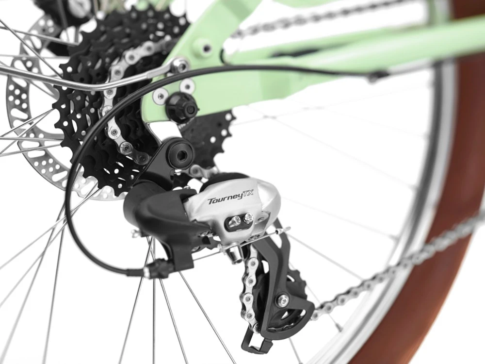 - Shimano shifter and rear derailleur provide smooth transitions through all 8 gears
