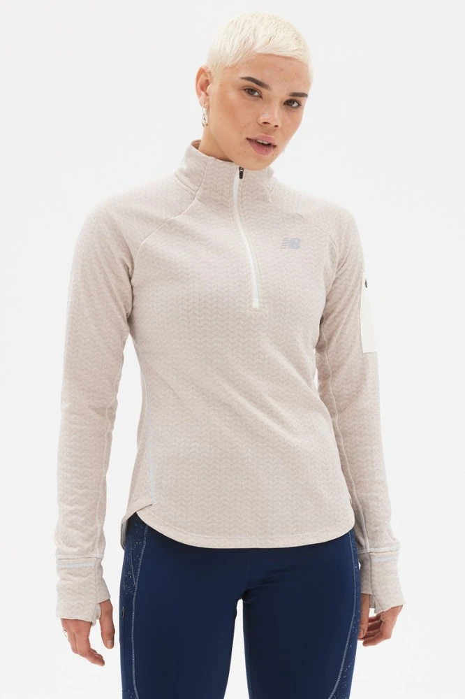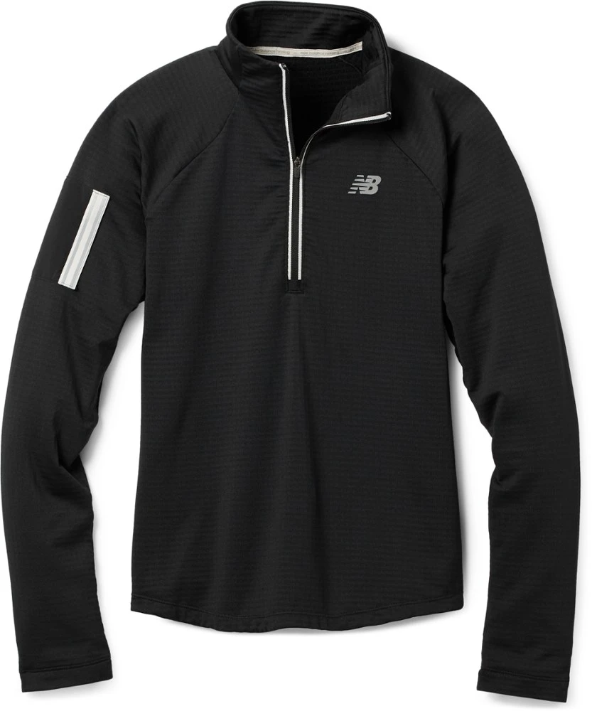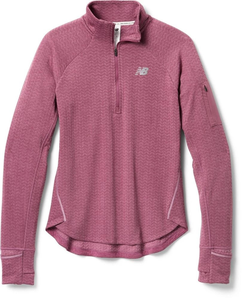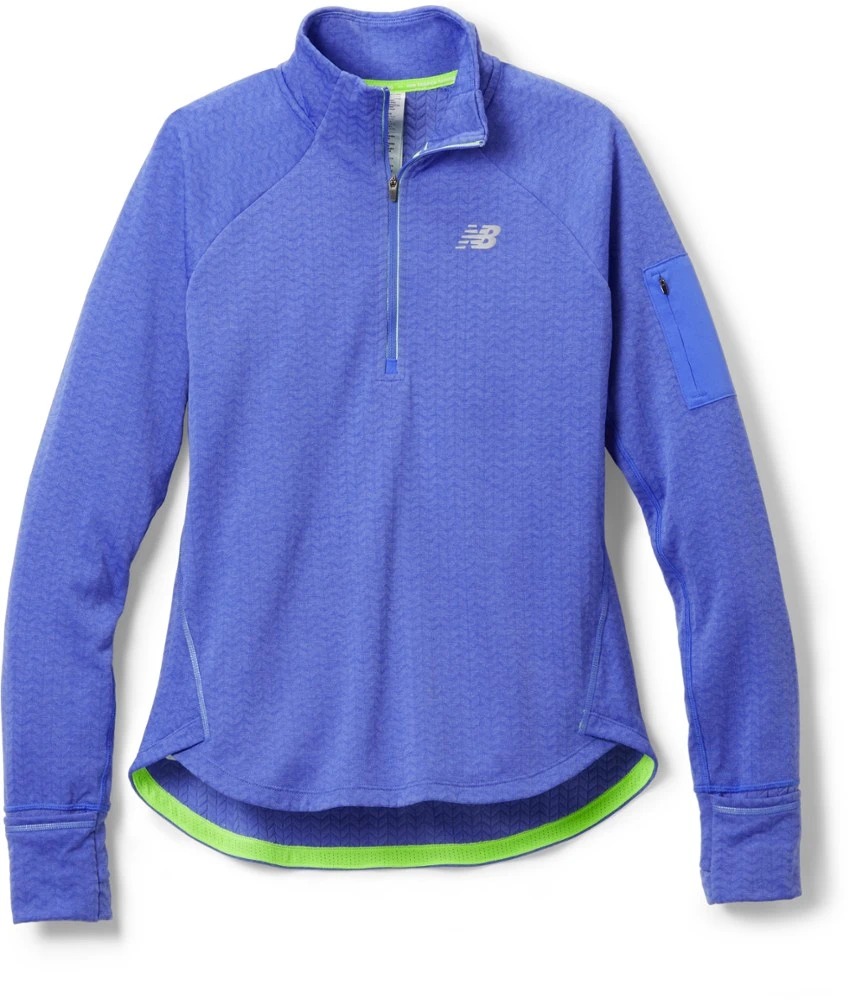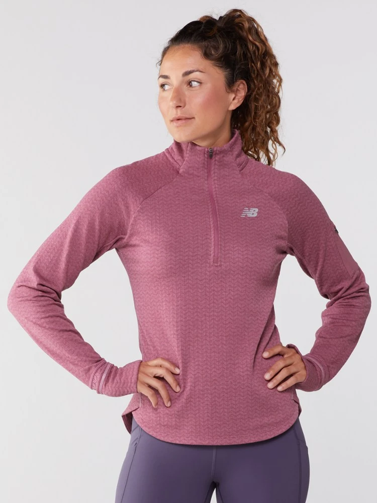 Designed for winter running, the women’s New Balance NB Heat Grid Half-Zip top features a streamlined silhouette and NB HEAT tech to keep you feeling warm and comfortable on chilly runs.
