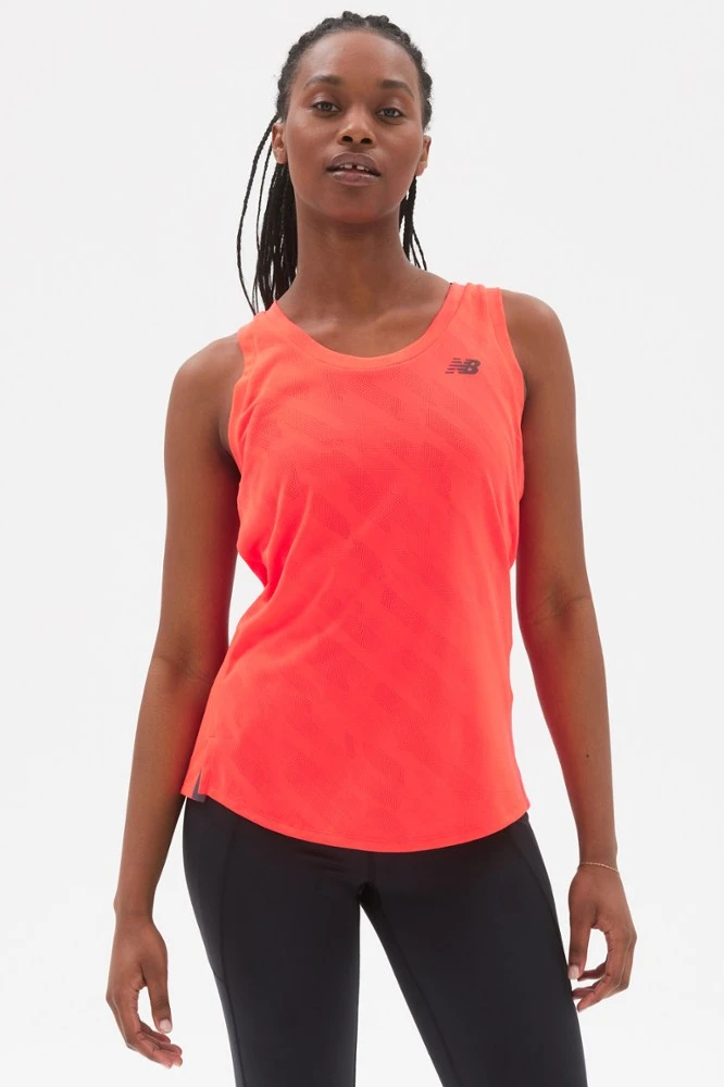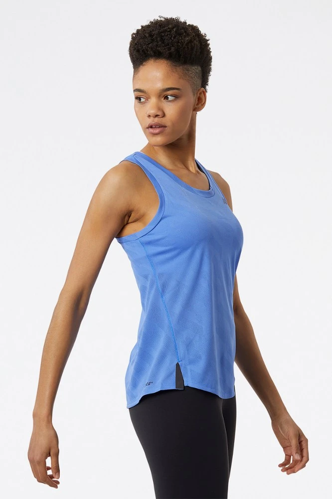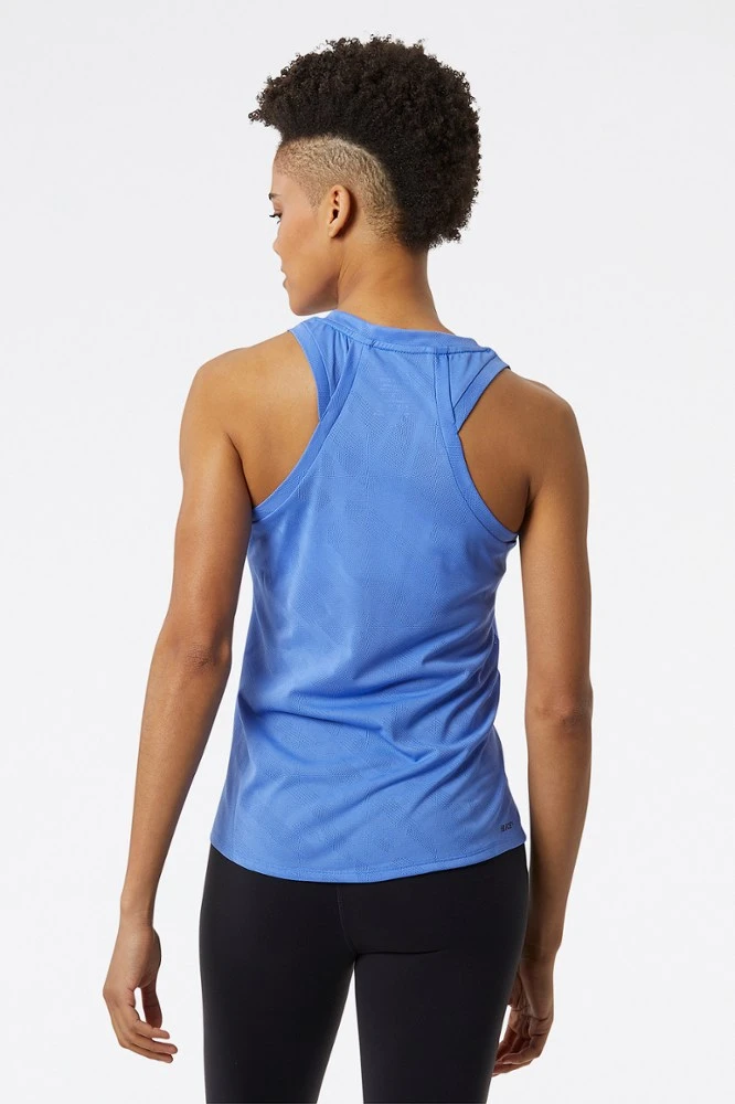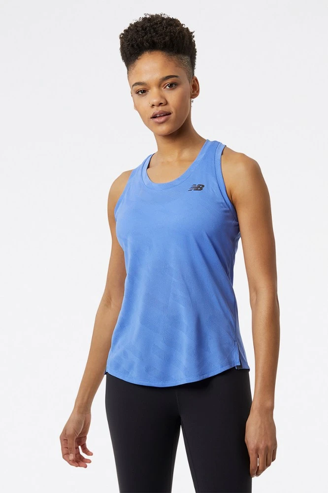 Inspired by urban run crews and unsanctioned races, the women’s New Balance Q Speed jacquard tank top is made for active movement with a body-skimming fit.
