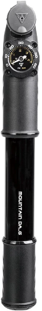 Topeak Mountain DA G mini pump with large barrel uses Dual-Action (DA) to double the volume with each stroke, inflating to pressure fast. Integrated 1-1/8 in. diameter analog gauge is easy to read.