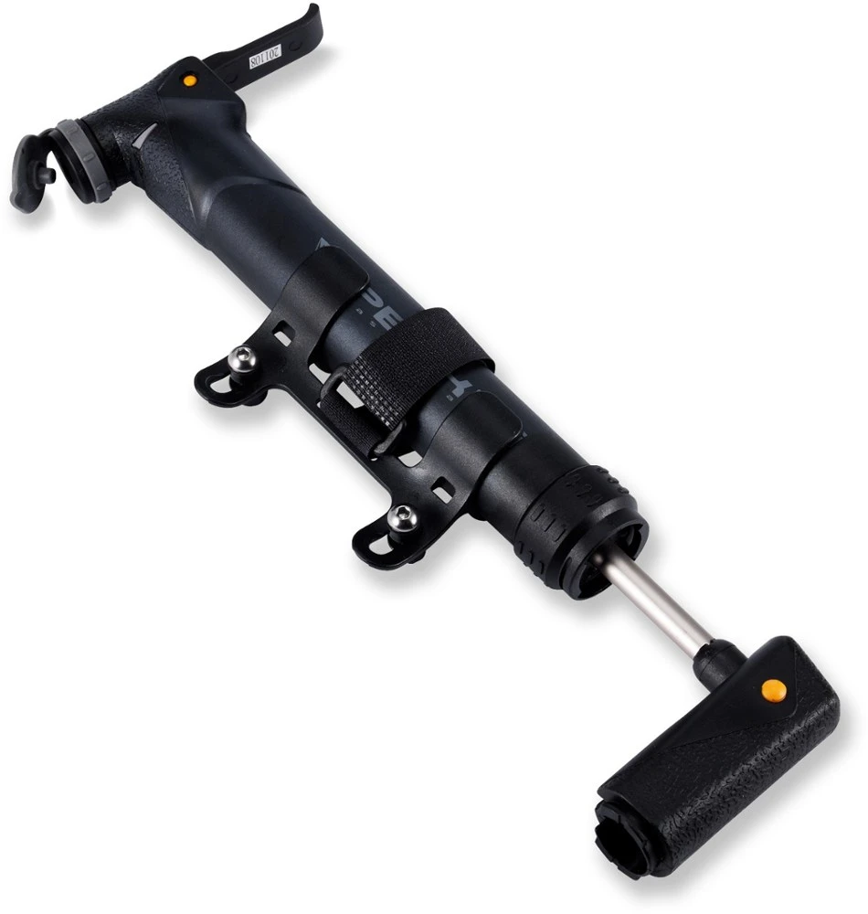 The Topeak Peakini II mini pump features an efficient single-stroke pumping action that inflates tires up to 90 psi via the T-handle that provides solid grip and comfort while pumping.