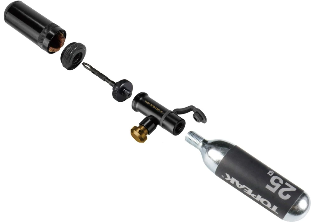 For tire repair and inflation, turn to the micro-size Topeak Tubi Master X tool. Its innovative 2-in-1 CO2 injector head repairs and inflates tubeless tires at the puncture site in one step.